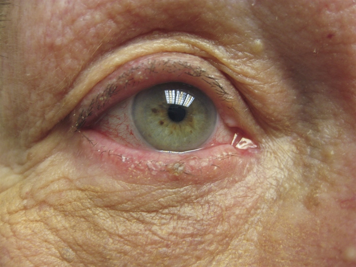A 63-year-old man comes to the office due to eye discomfort. For the last 3 weeks, he has had a sensation of “dirt in my eyes” associated with erythema and tearing. The patient attempted treatment with saline irrigation and oral antihistamines but had to discontinue due to urinary hesitancy and nocturia. Medical history is notable for type 2 diabetes mellitus, coronary artery disease, and benign prostatic hyperplasia. The patient’s vital signs are normal. On examination, he has increased vascularity and mild erythema of the conjunctivae, as shown in the image below. Pupillary reflexes, visual acuity, and funduscopic examination are normal. The patient also has erythema and scattered pustules involving the cheeks and nose.