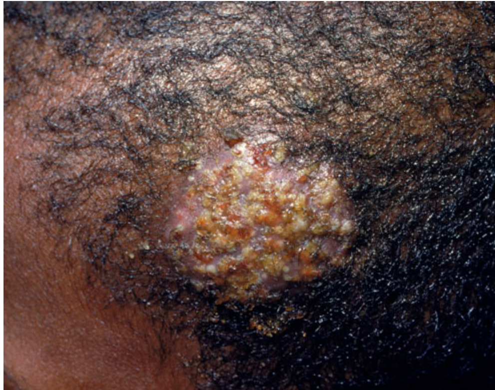 A 6-year-old boy is brought to the physician because of hair loss and a lump on his scalp. His mother says that she first noticed the lump 5 days ago and it appears to be increasing in size. There is no history of serious illness, and he takes no medications. His temperature is 37°C (98.6°F). A photograph of the lesion is shown. A tender 2-cm occipital lymph node is palpated. Which of the following is the most likely causal organism?