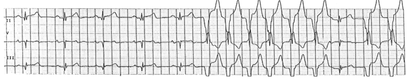 A 72-year-old man is brought to the emergency department 20 minutes after collapsing at a local restaurant. He was waiting to get his coat when he passed out. He did not lose bowel or bladder control and was awake and oriented when the paramedics arrived. He has coronary artery disease and sustained a myocardial infarction 3 years ago. His current medications include enalapril, metoprolol, aspirin, and pravastatin. Examination shows no abnormalities. Laboratory studies, including measurement of cardiac enzyme activities, are within normal limits. A CT scan of the head shows no abnormalities. An ECG is shown. Which of the following is the most likely cause of this patient’s symptoms?
