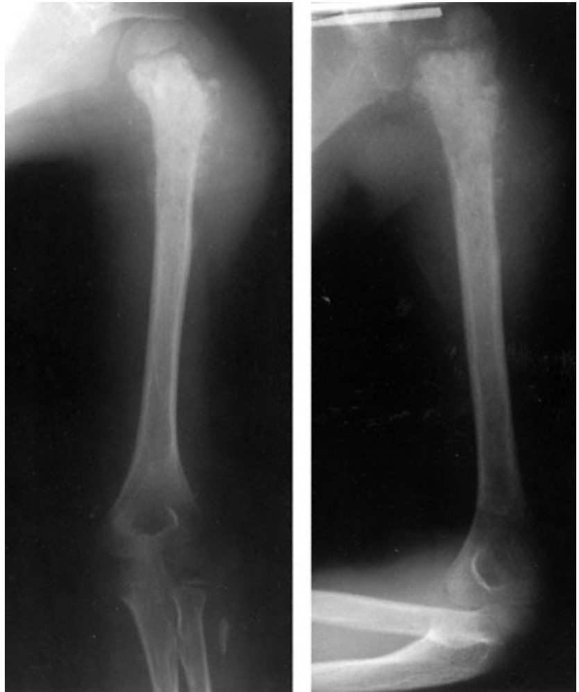A previously healthy 7-year-old boy is brought to the physician because of a 3-week history of pain in his left shoulder and arm. He has difficulty raising his left arm over his head. The pain is worse with motion and at night; it often awakens him from sleep. Over-the-counter medications have not relieved the pain. There is no history of trauma. Examination of the left shoulder shows diffuse tenderness of the greater tuberosity involving the entire humoral head. Passive range of motion of the left shoulder is limited to 90 degrees of abduction and 70 degrees of forward flexion. Extension and flexion of the left wrist are full. Muscle strength and sensation are intact. Radial pulses are palpable bilaterally. X-rays of the left upper extremity are shown. Which of the following is the most appropriate next step in management?