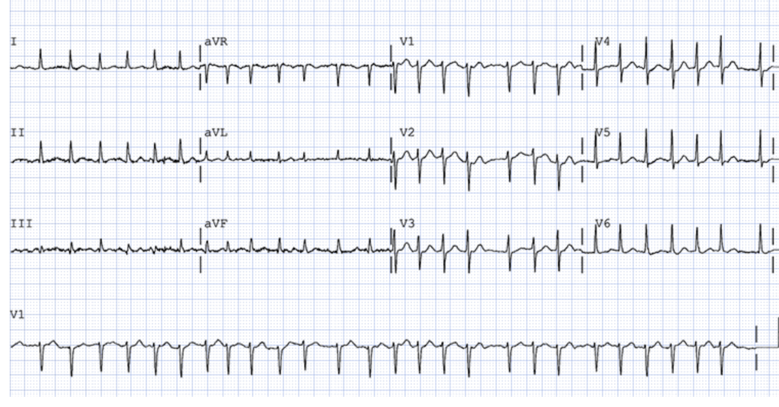 A 52-year-old man is brought to the emergency department because of a 6-hour history of thirst and fatigue and a 2-hour history of light-headedness. He has been working outside during the past 2 days in temperatures reaching 90.0°F. He has no history of serious illness and takes no medications. On arrival, he is lethargic and disoriented. His temperature is 37.2°C (99.0°F), pulse is 150/min and irregular, respirations are 16/min, and blood pressure is 78/50 mm Hg. The lungs are clear to auscultation; no bruits are heard. No murmurs are noted on cardiac examination. The abdomen is nontender. ECG is shown. In addition to administration of 0.9% saline, which of the following is the most appropriate next step in management?