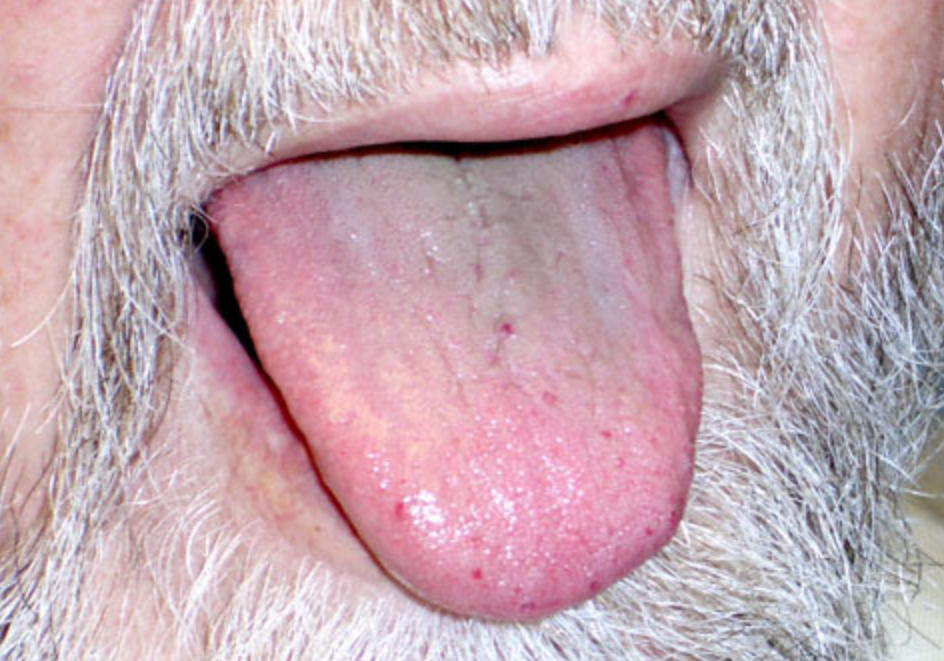 A 67-year-old man comes to the physician for a follow-up examination. Three days ago, he went to the emergency department because of a prolonged nosebleed that was not related to any injuries; after undergoing nasal packing for 4 hours, he was discharged and advised to schedule a follow-up examination with his primary care physician. During the past 3 years, he has had two similar nosebleeds, one of which required cauterization. He has had two episodes of upper gastrointestinal bleeding during the past 10 years. He has psoriasis and osteoarthritis. Current medications include acetaminophen and topical betamethasone cream. He avoids use of aspirin and aspirin-containing medications. He has smoked one pack of cigarettes daily for 45 years. He drinks one alcoholic beverage daily. He does not use illicit drugs. His temperature is 37°C (98.6°F), pulse is 72/min, respirations are 16/min, and blood pressure is 130/76 mm Hg. Jugular venous pressure is 7 cm H20. A photograph of the lips and tongue is shown. The lungs are clear to auscultation. There are no murmurs or gallops. The abdomen is soft and nontender with no hepatosplenomegaly. There is no peripheral edema. Laboratory studies from 3 days ago show: