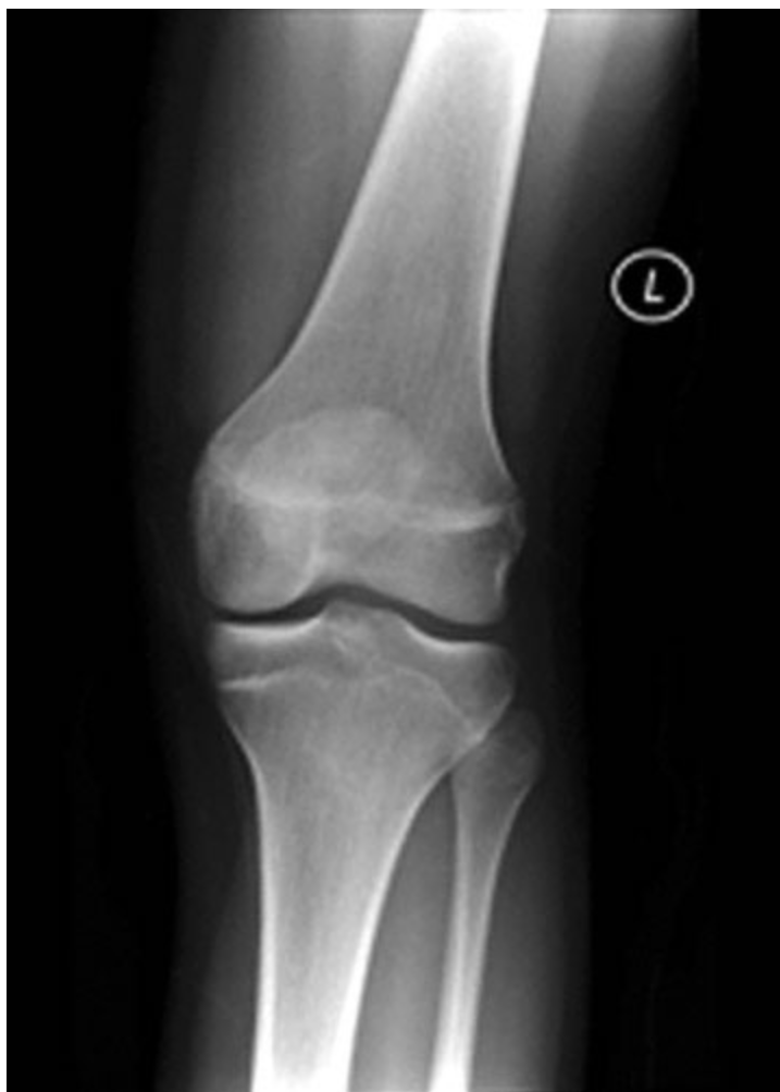 An 82-year-old woman with hypertension comes to the physician because of a 9-month history of moderate pain in her hips and knees. She has an active lifestyle and lives independently with her husband. Her medications are hydrochlorothiazide, metoprolol, and a calcium supplement. Her blood pressure is 128/84 mm Hg. Examination shows mild limitation on external rotation of both hips. On standing, the patient has pain in the right knee that she rates as an 8 on a 10-point scale. Laboratory studies show: