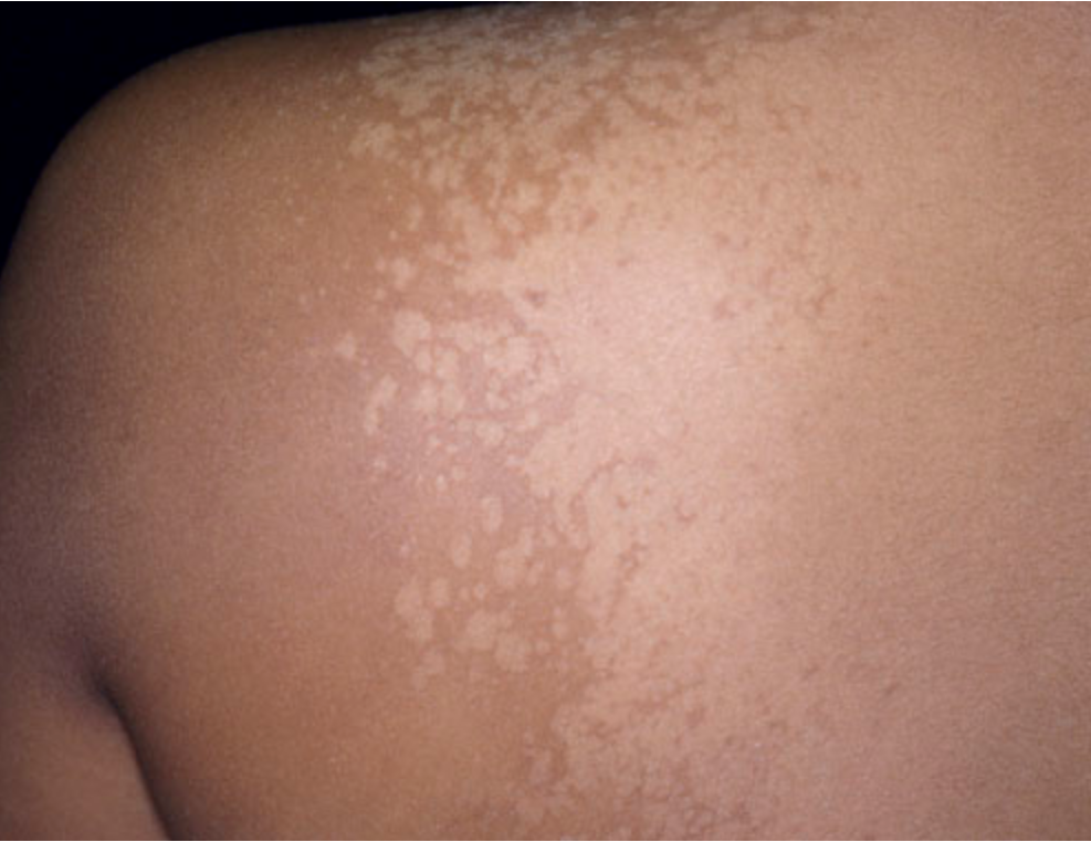 A 15-year-old girl is brought to the physician 2 weeks after noticing multiple areas on her chest and upper back that are lighter than the rest of the skin. She has mild itching over these areas when she plays volleyball. A photograph of the lesions is shown. Which of the following is the most likely diagnosis?