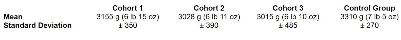 A study is conducted to evaluate the effects of smoking on birth weight at term. Four cohorts of 10 pregnant patients each are identified on the basis of cigarette use. In cohort 1, patients smoke less than one pack of cigarettes daily; in cohort 2, patients smoke one to less than two packs of cigarettes daily; and in cohort 3, patients smoke two or more packs of cigarettes daily during pregnancy. The control group consists of patients who have never smoked cigarettes. Results of the study show the following birth weights: