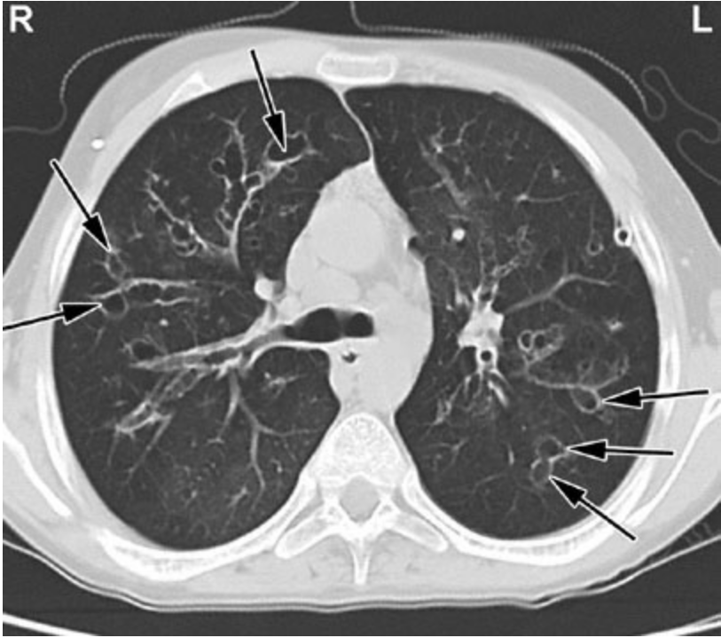 A 5-year-old boy is brought to the physician by his parents as a new patient because they are concerned that he may have an immunodeficiency. The family recently moved to the area. The parents say their son’s previous physician had been examining him for the condition. The patient has had six episodes of pneumonia and 10 episodes of sinusitis since birth. He underwent uncomplicated surgical drainage of the sinuses at the ages of 3 and 4 years. He had his first episode of otitis media at the age of 2 months and underwent uncomplicated placement of tympanostomy tubes at the age of 7 months. His umbilical stump fell off at the age of 2 weeks. The patient’s previous leukocyte, lymphocyte, and platelet counts; serum immunoglobulin and CH50 concentrations; and diphtheria, tetanus, pneumococcal, and Haemophilus influenzae type b titers are within the reference ranges. Six previous chest x-rays showed lower lobe consolidations in inconsistent locations; subsequent x-rays showed clearing of the infiltrates. Today, vital signs are within normal limits. Examination shows no abnormalities. A CT scan of the chest is shown. Which of the following is the most likely diagnosis?
