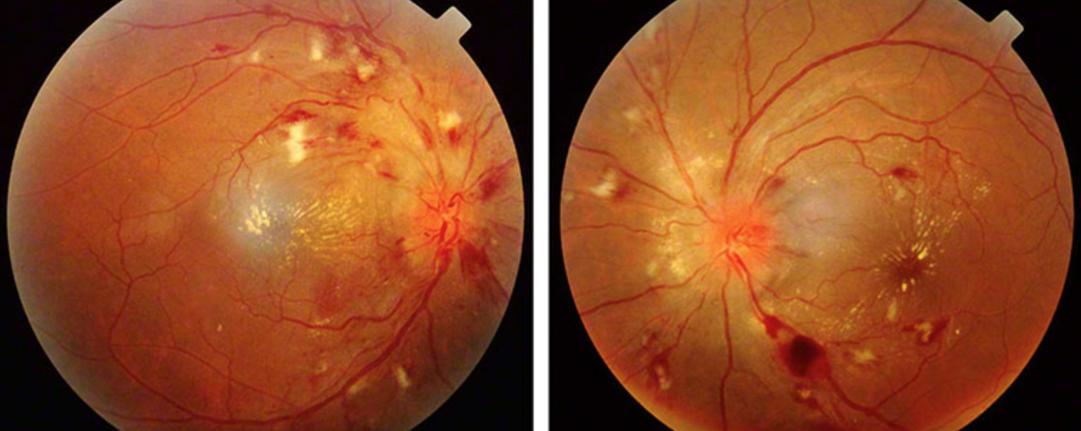 A 57-year-old man comes to the emergency department because of a 3-week history of headaches that have been increasing in severity and frequency. He also has a 2-week history of progressive blurred vision in both eyes. He has not had pain in the eyes. His last visit to a physician was 10 years ago because of pain in his fingers; at that visit, he was told he had high blood pressure. His temperature is 37°C (98.6°F), pulse is 90/min, respirations are 12/min, and blood pressure is 200/110 mm Hg. Repeat blood pressure measurements are 210/112 mm Hg and 214/114 mm Hg. Findings on funduscopic examination are shown. Examination shows ulnar deviation of both hands and several swollen interphalangeal joints. His fasting serum glucose concentration is 160 mg/dL. Which of the following is the most likely underlying cause of this patient’s symptoms?