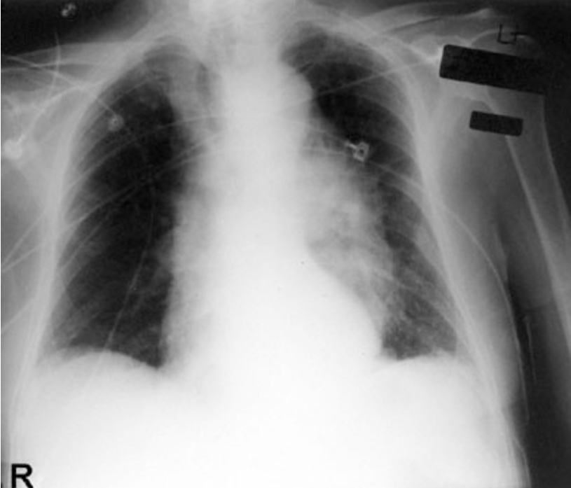 A chest x-ray shows bilateral pulmonary infiltrates. Which of the following is the most likely cause of these findings?