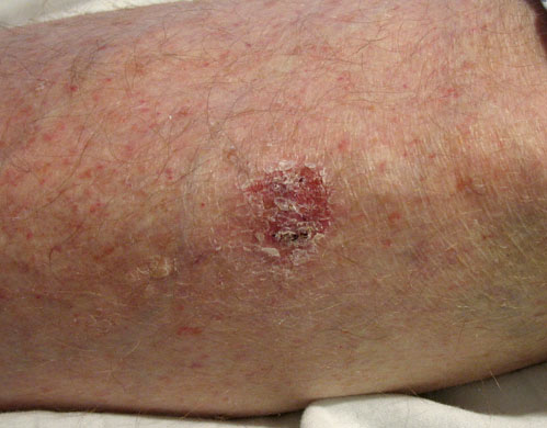 A 47-year-old man comes to the office because of a 6-month history of a nonpainful, nonitchy lesion over his left forearm. Three years ago, he underwent a renal transplant for chronic renal failure secondary to IgA nephropathy. His only medication is tacrolimus. Vital signs are within normal limits. A photograph of the lesion is shown. The remainder of the examination shows no abnormalities. Which of the following is the most likely diagnosis?
