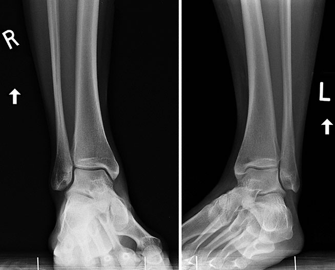 A 27-year-old woman comes to the physician because of a 6-month history of increasing pain and progressive swelling and stiffness of her ankles. Despite nightly application of ice to her ankles, ibuprofen therapy, and decreased activity during the past 3 months, her pain has worsened, she has had swelling of her ankles throughout the day, and she has had morning stiffness of her ankles. She has sustained no recent trauma to her ankles. She had a severe right ankle sprain in college. Her only other medication is an oral contraceptive. She is an avid tennis player and plays twice weekly. Vital signs are within normal limits. Examination shows swelling and moderate effusion of both ankles. Range of motion of both ankles is full but produces mild pain. X-rays of the ankles are shown. Which of the following is the most likely cause of this patient’s symptoms?