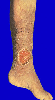 A 56-year-old man comes to the office because of a 3-month history of an enlarging painful ulcer on his left ankle. The ulcer occasionally exudes a clear, yellow fluid. He has cleaned the ulcer daily with soap and lukewarm water and applied an over-the-counter topical antibiotic to the area, with minimal relief. He has not had fever or chills or sustained any recent trauma. He has type 2 diabetes mellitus, coronary artery disease, hypertension, and hyperlipidemia. His medications are metformin, glipizide, atorvastatin, enalapril, hydrochlorothiazide, metoprolol, isosorbide mononitrate, and aspirin. He has no known drug allergies. He smoked one and one-half packs of cigarettes daily for 33 years but quit 5 years ago. He is 180 cm (5 ft 11 in) tall and weighs 90 kg (198 lb); BMI is 28 kg/m2. Vital signs are within normal limits. He does not appear to be in acute distress. A photograph of the left lower extremity is shown. Dorsalis pedis pulses are 2+ bilaterally; posterior tibial pulses cannot be palpated. Monofilament testing shows decreased sensation over the feet; proprioception is intact. Which of the following is the most likely diagnosis?