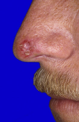 A 57-year-old man comes to the physician because of a 1-year history of an enlarging painless lesion on his nose. The lesion sometimes bleeds when he washes his face. He has no history of serious illness and takes no medications. His temperature is 36.8°C (98.2°F), pulse is 84/min, respirations are 16/min, and blood pressure is 128/78 mm Hg. Examination shows the lesion in the photograph and no other abnormalities. Which of the following is the most likely diagnosis?