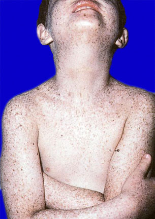 A 4-year-old boy is brought to the office by his parents because of a 2-year history of sunburns and redness of both eyes. His parents say his skin becomes red and irritated after 15 minutes of sun exposure. Whenever he is outside, his eyes become red. Growth and development otherwise have been appropriate for age. Vaccinations are up-to-date. He is at the 50th percentile for height, weight, and BMI. His temperature is 37.0°C (98.6°F), pulse is 106/min, and respirations are 24/min. A photograph of the skin is shown. Ocular examination discloses injection of the conjunctival vessels without discharge bilaterally. Which of the following is most likely to develop in this patient during the next 10 years?
