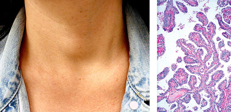 A 54-year-old woman comes to the office because of a 2-year history of gradually enlarging patches of discoloration on her hands. There is no itching or pain. She says she has not been using new soaps or lotions. Physical examination shows the findings in the photograph. It is most appropriate for the physician to evaluate this patient for the presence of which of the following additional conditions?
